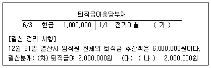 8. 다음은 (주)한공의 퇴직급여충당부채 계정과 결산 정리 사항이다. 결산 회계처리를 하였을 경우, (가)의 금액과 (나)의 계정과목으로 올바른 것은? (순서대로 (가), (나))