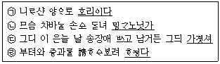 - ④ 한중진미(閑中眞味)ᄅᆞᆯ 알 니 업시 호재로다 → 한중진미를 알 리 없이 혼자로구나