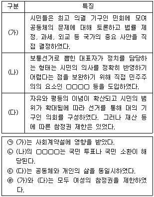 9. 다음은 시대별 민주 정치의 특징을 나타낸 것이다. 이에 대한 옳은 설명을 보기에서 모두 고른 것은? (단, (가)~(다)는 고대 아테네 민주 정치, 근대 민주정치, 현대 민주 정치 중 서로 다른 하나이다.)