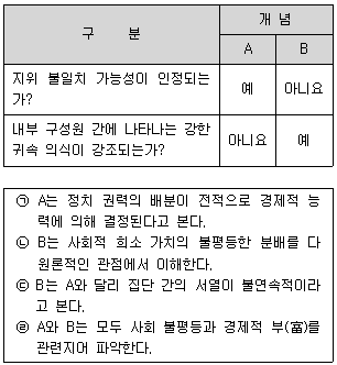 7. 다음 표는 사회 불평등 현상을 설명하는 개념 A, B의 일반적 특징을 나타낸 것이다. 이에 대한 옳은 설명을 보기에서 고른 것은? (단, A와 B는 각각 계급과 계층 중 하나에 해당한다.)