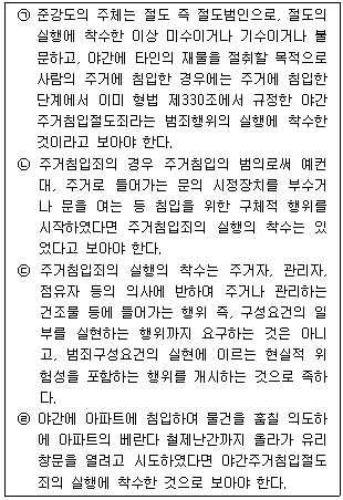 - ④ 야간에 신체의 일부가 집 안으로 들어간다는 인식하에 타인의 집의 창문을 열고 집 안으로 얼굴을 들이미는 행위를 하였다면 주거침입죄의 범의는 인정되지 않는다.