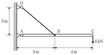 2. 그림과 같이 강체로 된 보가 케이블로 B점에서 지지되고 있다. C점에 수직하중이 작용할 때, 부재 AB에 발생되는 축력의 크기[kN]는? (단, 모든 부재의 자중은 무시한다)