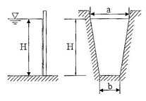 2. 그림과 같이 윗변과 아랫변이 각각 a, b이고 높이가 H인 사다리꼴형 평면 수문이 수로에 수직으로 설치되어 있다. 비중량 γ인 물의 압력에 의해 수문이 받는 전체 힘은?